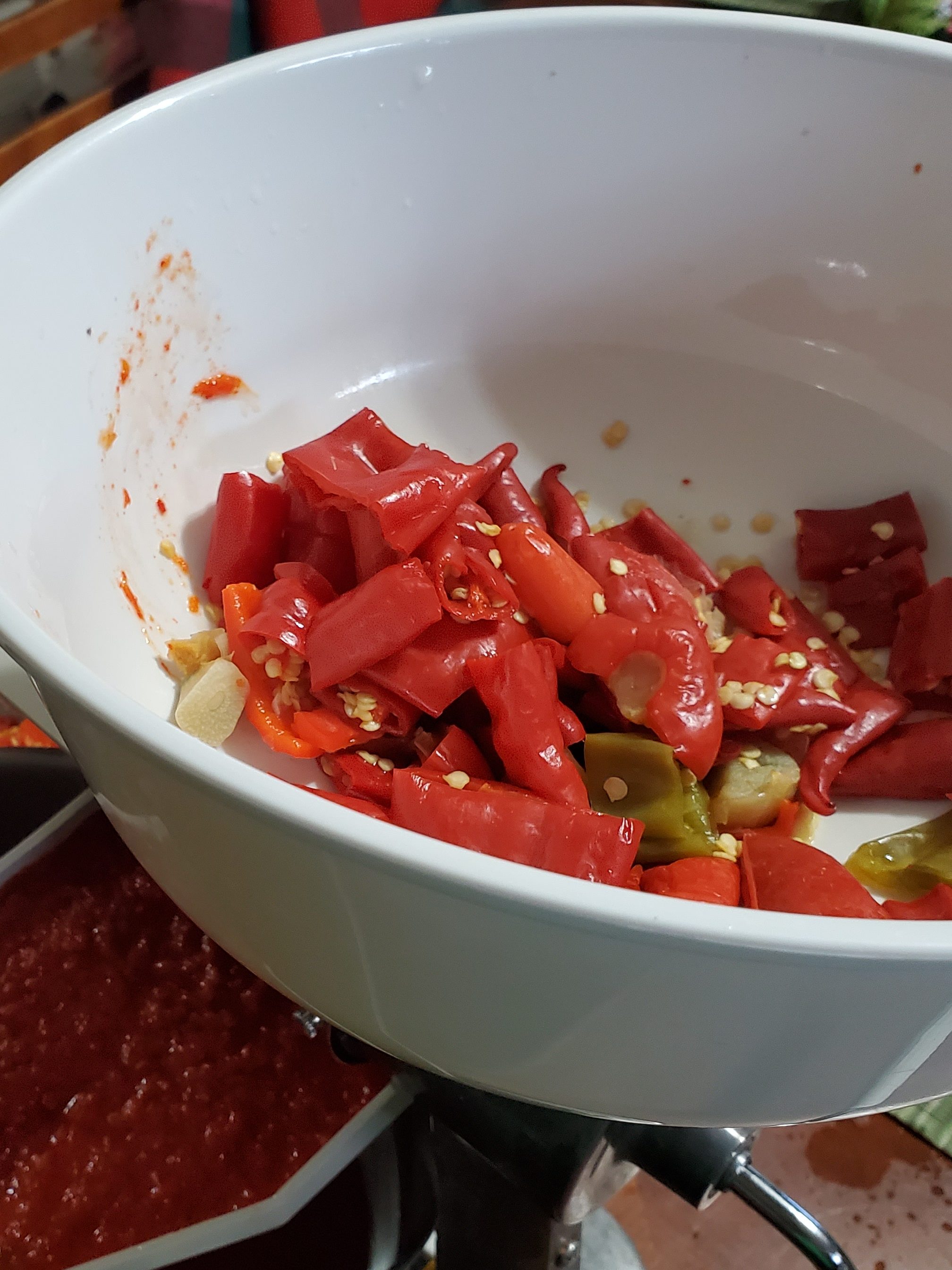Place your milled pepper mash along with 1/2 cup of the brine that you saved, 1.5 cups of vinegar and two tablespoons of salt in a sauce pan and bring it to a boil. Yes, I know that not everyone does this, I make large batches at a time, so I process mine in a hot water bath canner.