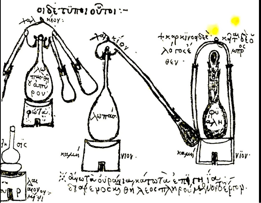 Another early illustration of a glass vase holding simmering liquid placed over a fire and covered with a conical top comes from a tablet found in the Keos, Crete excavation.