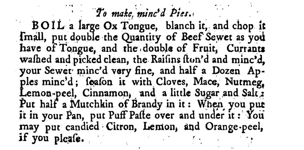 This recipe is very loosely based on a receipt shared by Elizabeth Cleland in 1755, as it’s as close to my family recipe as I have ever found. We are country folk. My grandmother used cow tongue instead of ox tongue, of course. She also made head cheese and venison sausage for the holiday buffet.