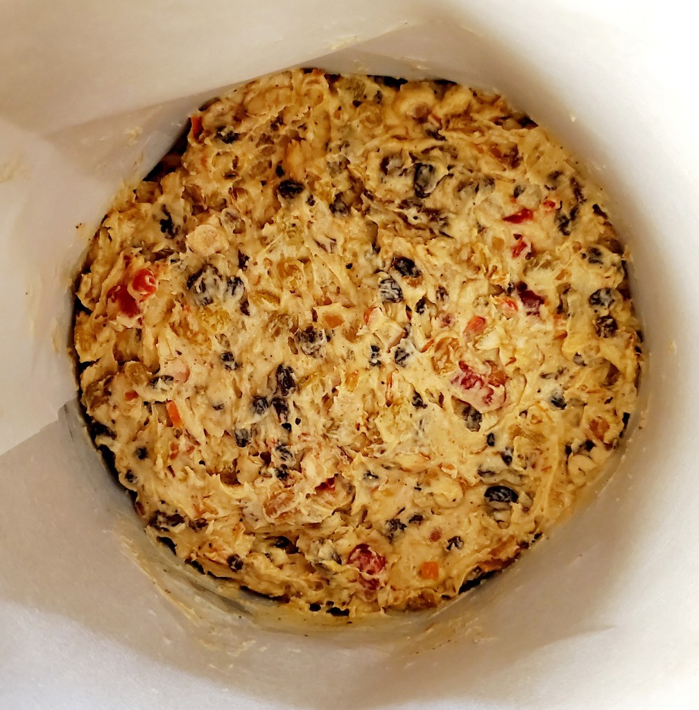 - When the flour is fully incorporated you can fold in the soaked fruit. That’s a lot of folding. You will probably find yourself singing “around the outside through the middle” before you are done.