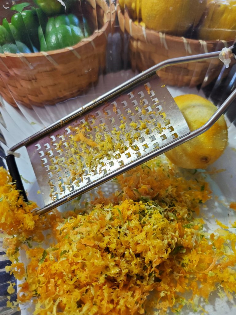 - While this is simmering you can zest your fruit into a bowl that has a tight-fitting lid and put the lid on when you are done. If you don’t have a zester like the one in the picture, you can just use a paring knife and peel them thinly.
