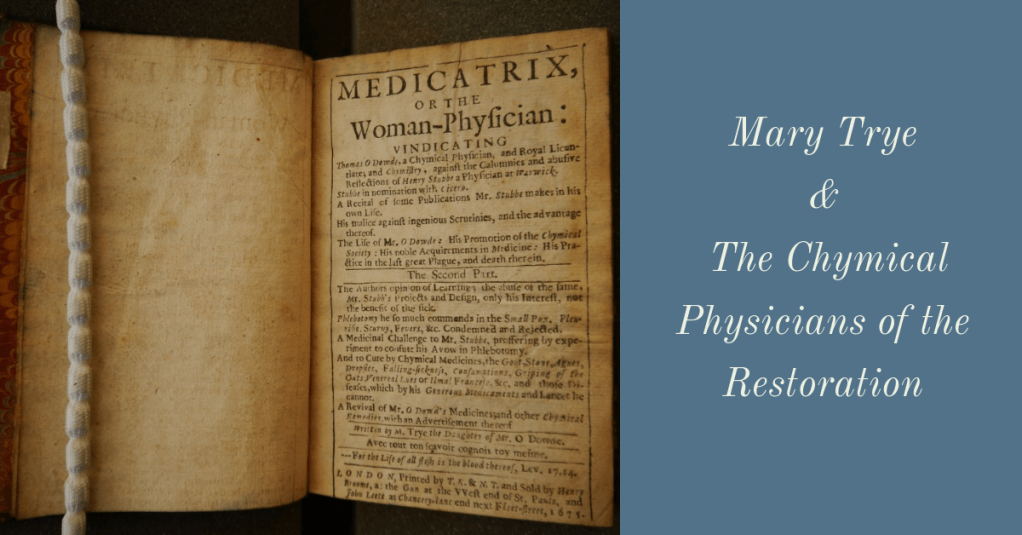 A letter written by O’Dowde shortly before his death could be interpreted as him trying to curry some favor with the King for himself and his fellow Chymical Physicians as he frames them as the valiant group of plague fighters who persisted when all the other medical providers fled. There is also this advertisement that lists O’ Dowde as one of the chymical physicians offering a plague cure. That didn’t work out so well for him. He contracted the plague and died in 1665. Trye, having been trained by her father, inherited his practice upon his death.[i]