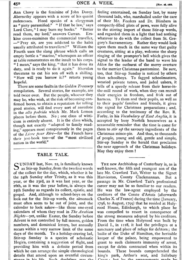 At some point, it became customary on the last Sunday of Trinity to “stir-up” concoctions such as mincemeat, which need a good long time to sit on the shelf and develop flavor. While it seems counterintuitive to let these things sit for such a long time, there is enough alcohol in them to preserve them. The day takes its name from a verse in The Book of Common Prayer published in 1662 but seems to have taken on a much more secular meaning during the Victorian era as the following article details.