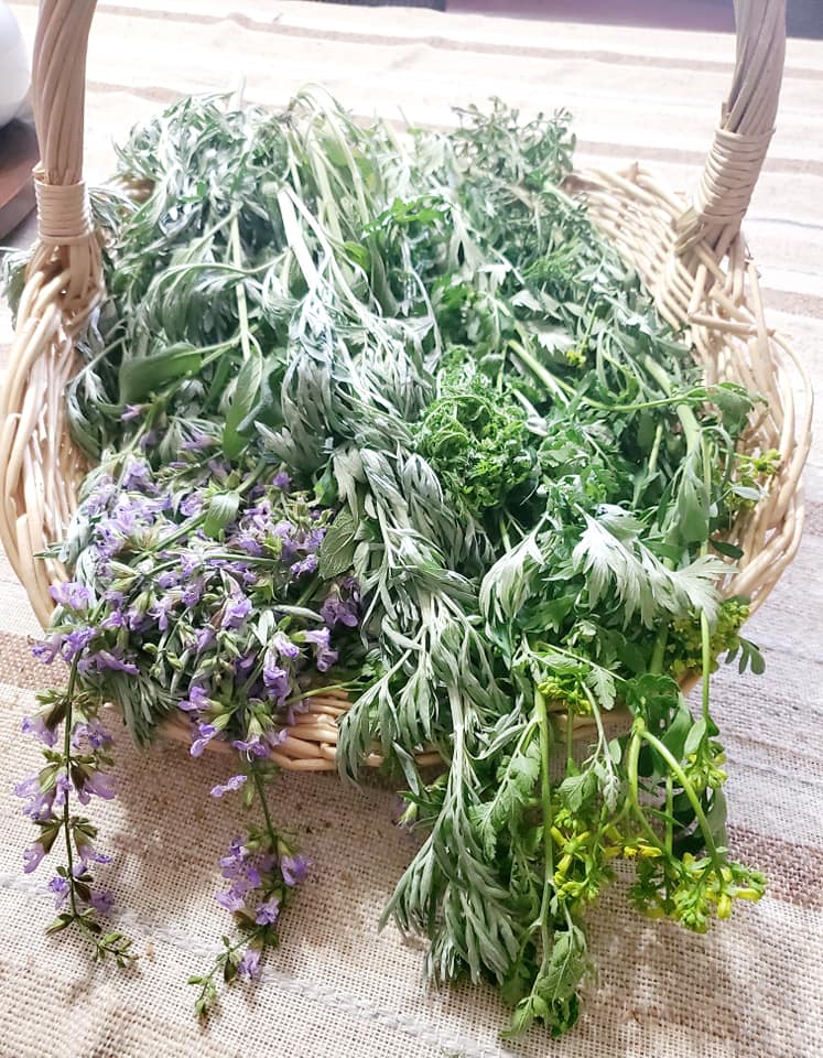 These herbs should be gathered when they are warm and dry. I like to gather them just as the sage flowers are forming and throw those in too. I spin them dry in a salad spinner to clean them. Chop the plant material well before measuring.
