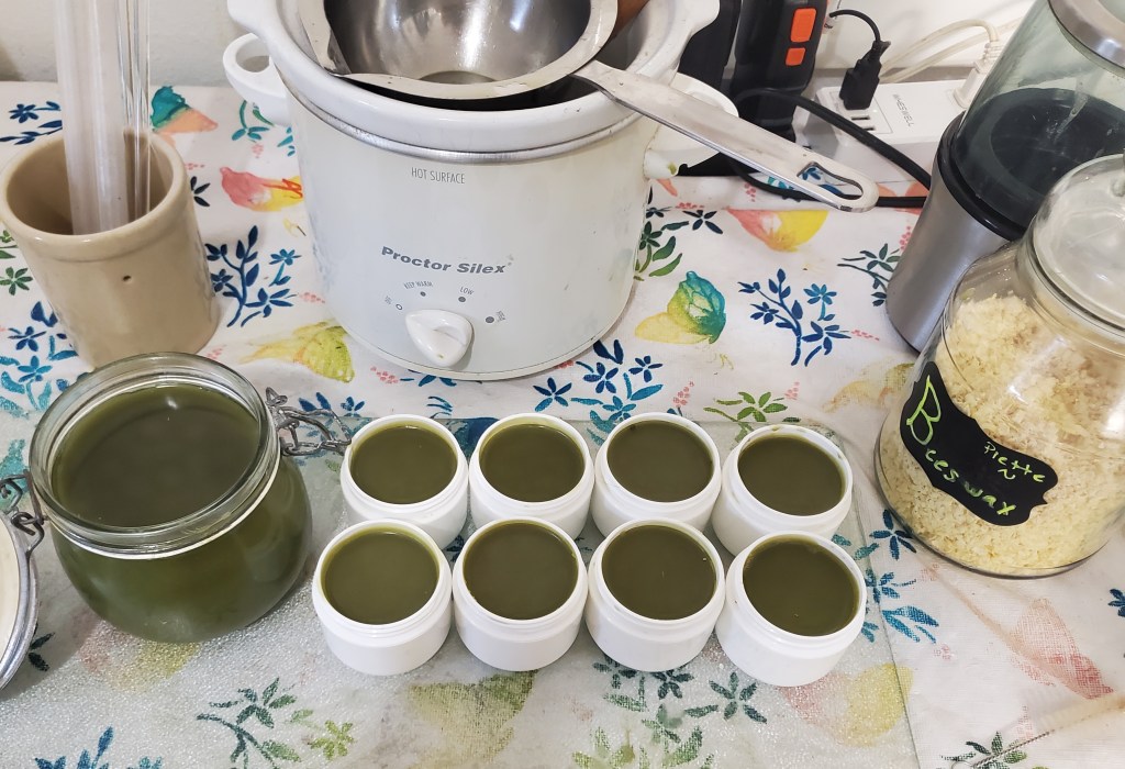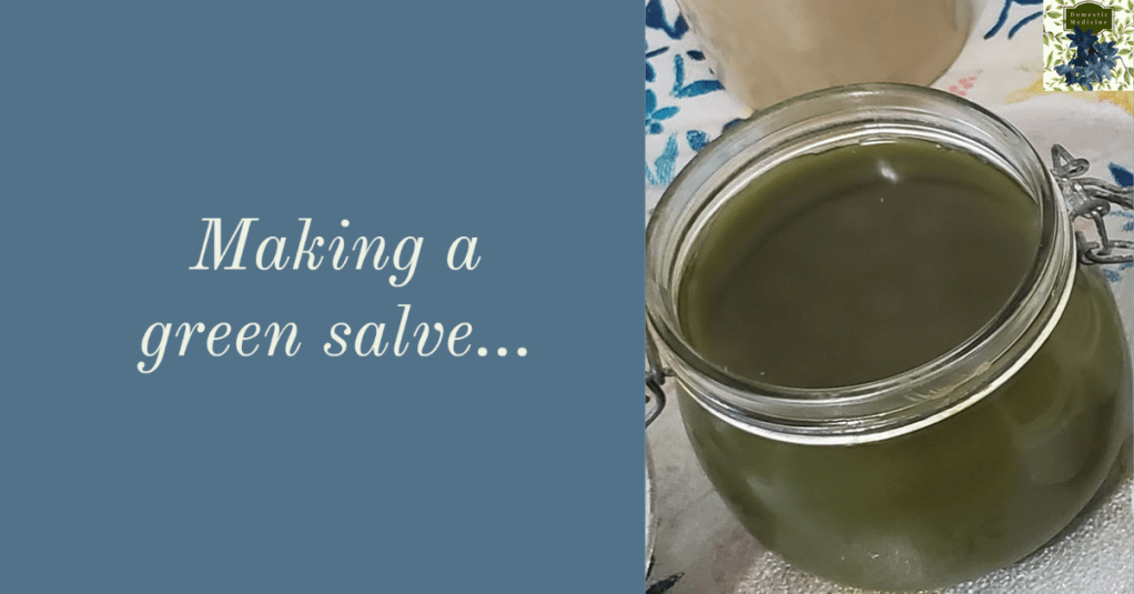 So, there you have my personal green salve receipt. This is not meant to be a hard cerate. If you want, you can melt 1 oz of beeswax into it after you have strained it. I do this when I am making it for first aid kits that will spend time in the sun along with using plastic containers. I will attach a file below that gives you another ointment receipt.