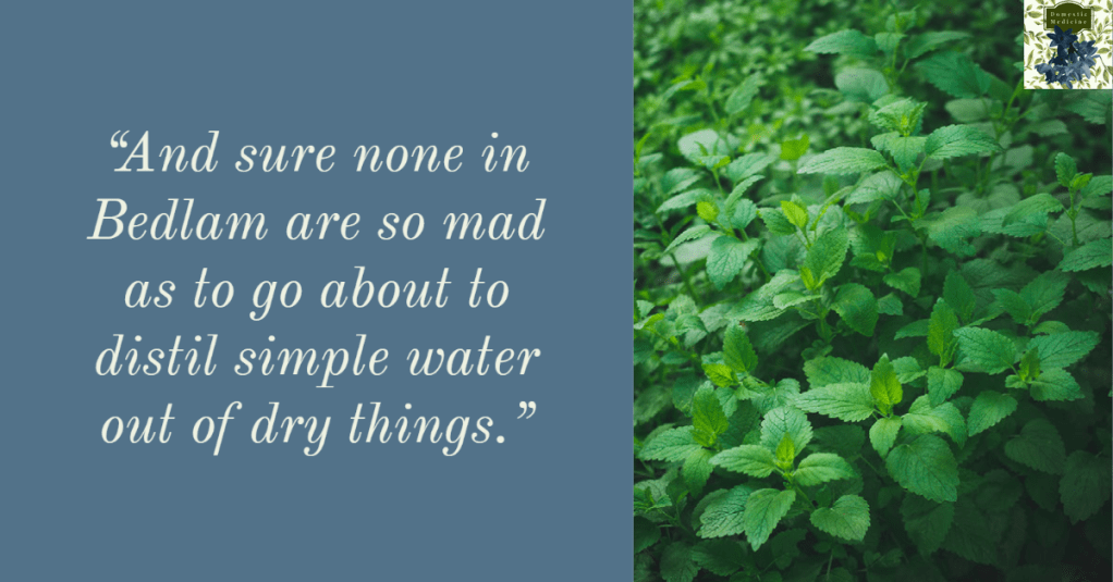 I already knew that Culpeper is quite outspoken in his opposition to using dried plants for distillation saying, “And sure none in Bedlam are so mad as to go about to distil simple water out of dry things. [2] His instructions for making a hydrosol would be impossible with dried plants.