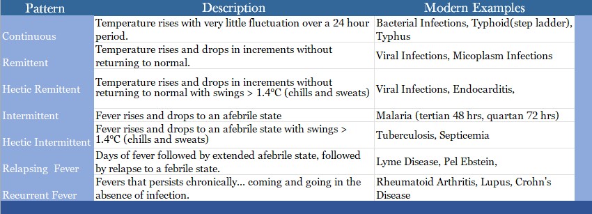Fevers occur in various patterns. Modernly we know that certain pathogens provoke specific fever patterns because the fever spikes line up in some way with the lifecycle of the pathogen. For example, different families of Malaria parasites sometimes produce different patterns of intermittent fevers.