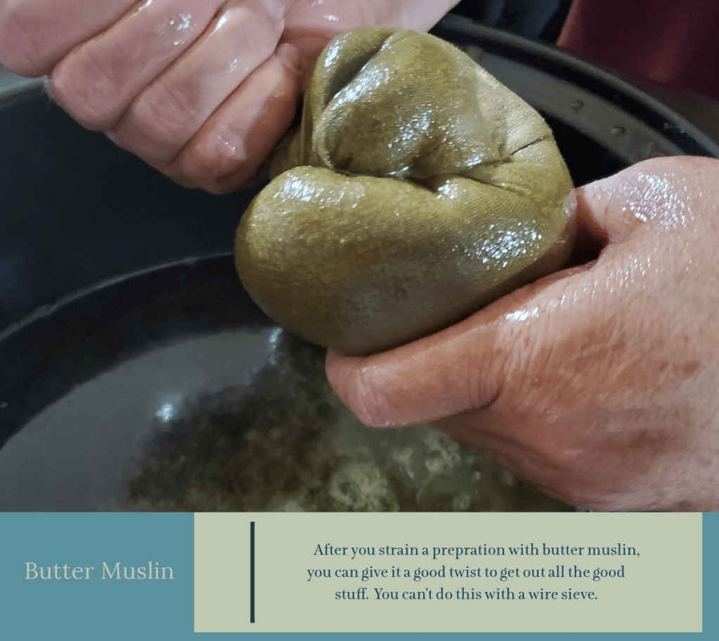Butter muslin is an inexpensive plain weave cotton fabric that is the equivalent weave of lawn or linen which was often used to strain preparations. It is what I use to strain preparations, make soft cheeses, and boil puddings. I will mention it a lot in recipes on this blog. The best part is that it is cheap, and you can rinse it out and use it again.
