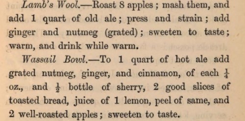 I am going to leave you with scans of two 19th century cookbooks that publish receipts for both Lamb’s Wool and another recipe for the Wassail bowl. If you are feeling adventuresome, you could give either a try. I actually like lambswool enough to make it with non-alcoholic beer, although I leave out the ginger. It’s nice to be able to offer visitors who don’t imbibe a reasonably authentic experience.