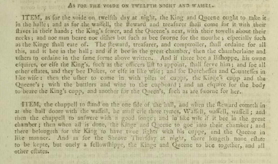 Wassail is simply an English way of saying “to your health”, like the Irish sláinte. Wassailing is an action word meaning to toast a person’s health. The wassail bowl is a bowl with which you offer this toast. At various points in history, wassailing has been associated with the winter holidays Christmas, New Year’s, or Twelfth Night, depending on which celebration was in vogue at the time. One of the best explanations we have of medieval practice is the following from Henry VII’s ordinances. (1494)4