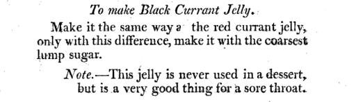You may recall that I have talked about black currant tea made from this jelly in a medicinal sense. According to Hannah Glasse, it was strictly a medicinal preparation but I disagree. I made an excellent Bakewell Tart with a jar last fall.