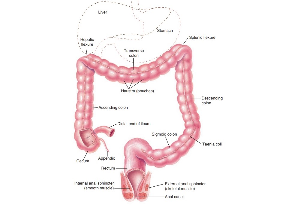 The large intestine is the final segment of the gastrointestinal tract, typically about 1.5 meters (5 feet) in length and has a diameter larger than the small intestine. Its primary sections include the cecum, ascending colon, transverse colon, descending colon, sigmoid colon, and rectum, each with specialized functions in water absorption, waste formation, and eventual expulsion.