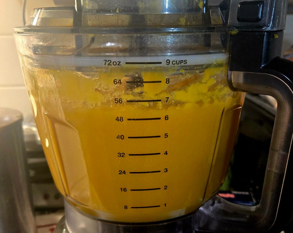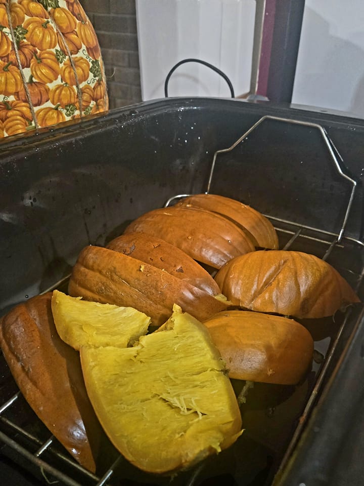 You will want to begin processing your pumpkins by cutting them in fourths and cleaning out the insides. Be sure to save some seeds for next years garden. Put them face down on a rack in a roaster or a crockpot and put about 2 inches of water in the bottom of the roaster