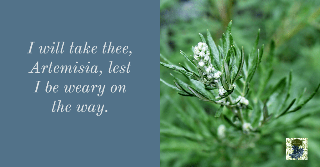 In the first part of the Anglo-Saxon Leech Book, travelers are told to pick the plant while making the sign of the cross and hold mugwort in their hand or put it in a shoe while saying. “I will take thee, Artemisia, lest I be weary on the way.”[9]
